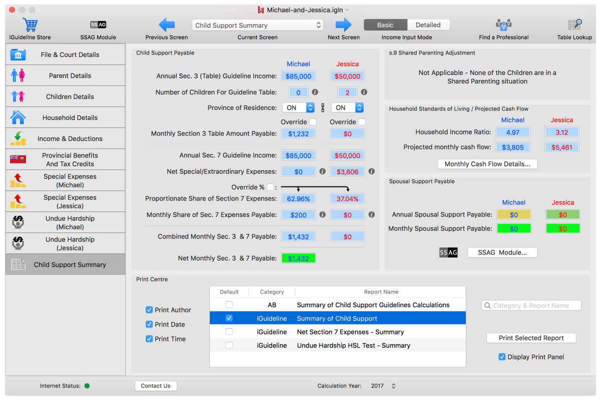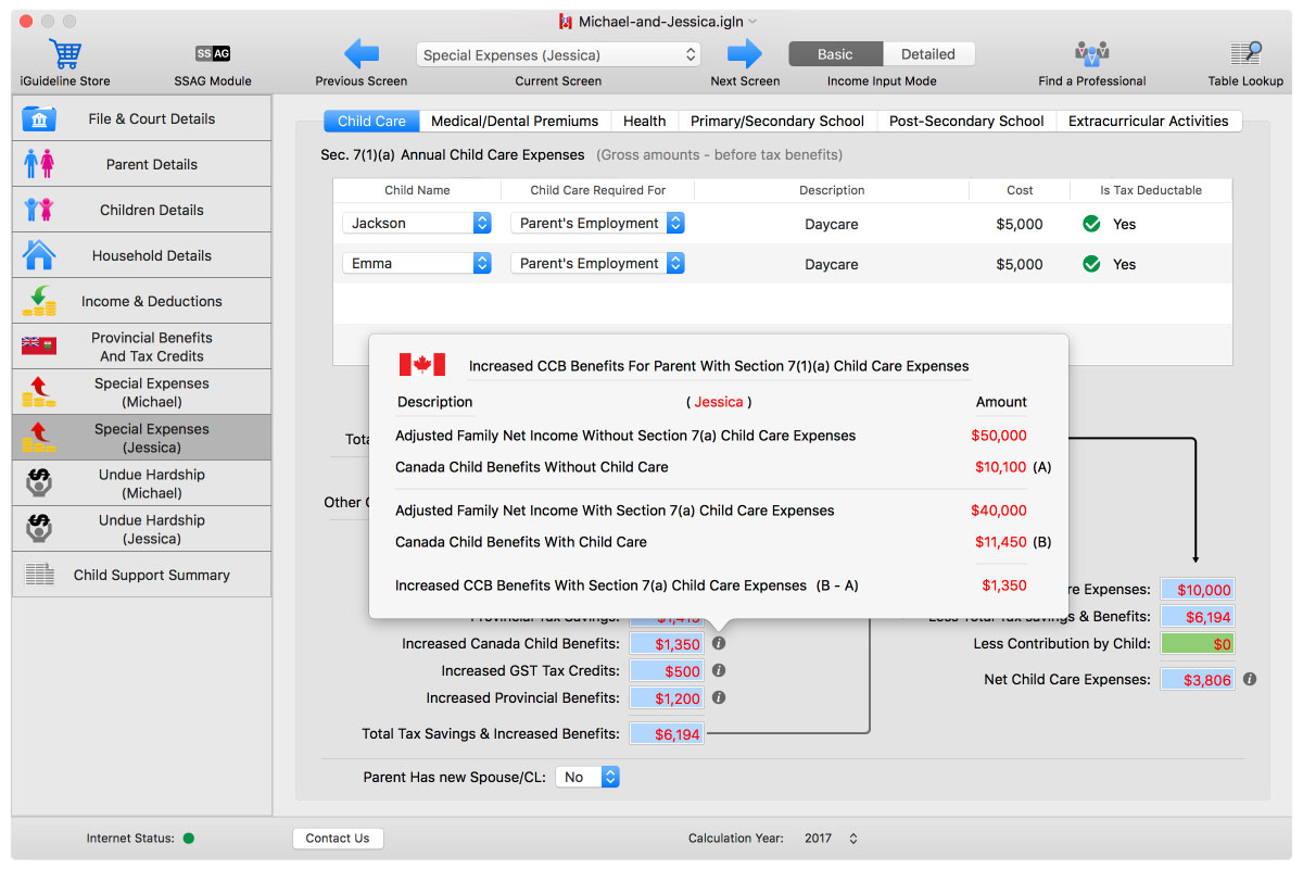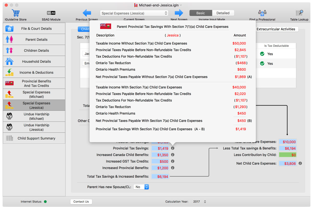 iGuideline not only does the correct calculation, but iGuideline also shows users the particulars of the tax savings and increased Benefits, as well as details of how those numbers were calculated. Below is a gallery of screen shots from iGuideline showing those amounts in this particular scenario: